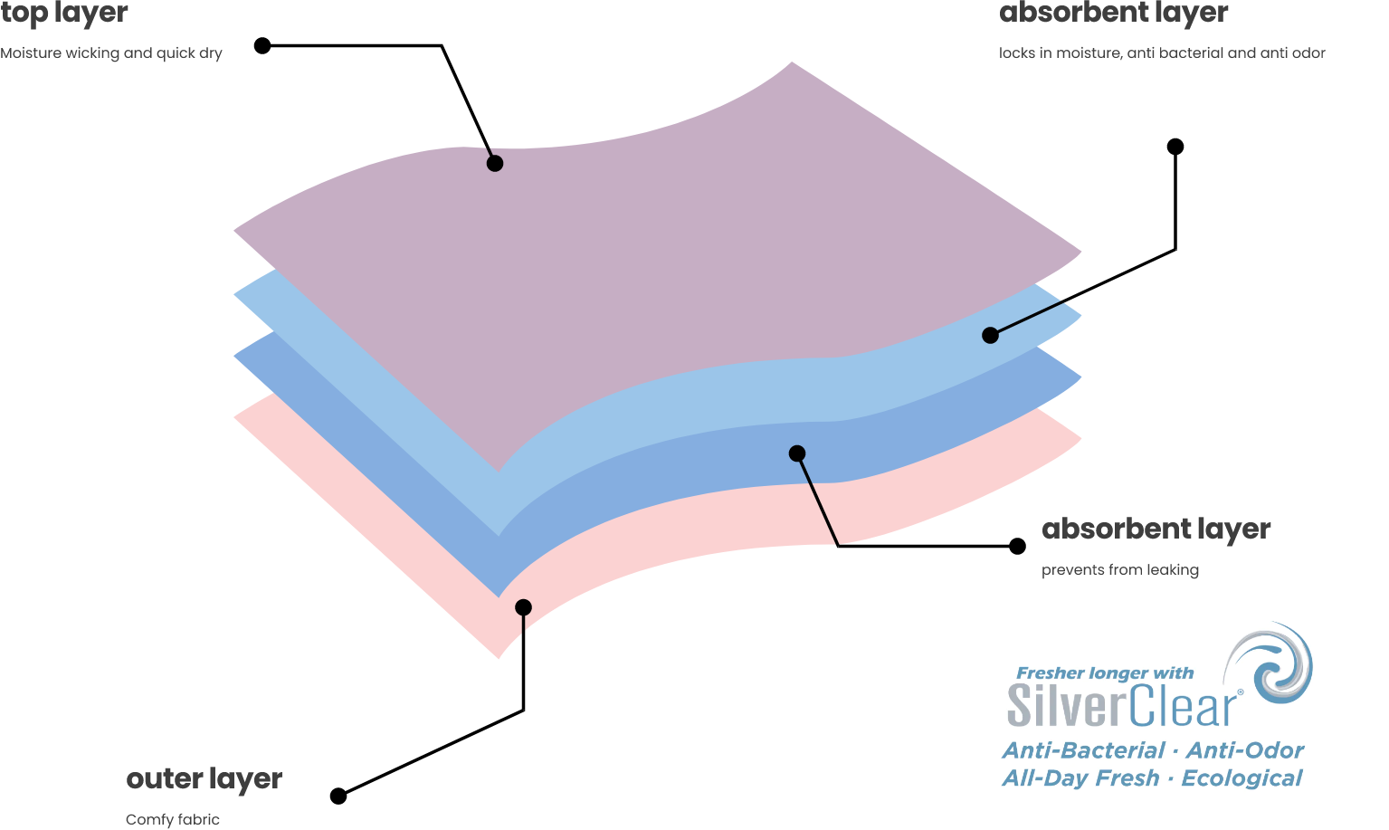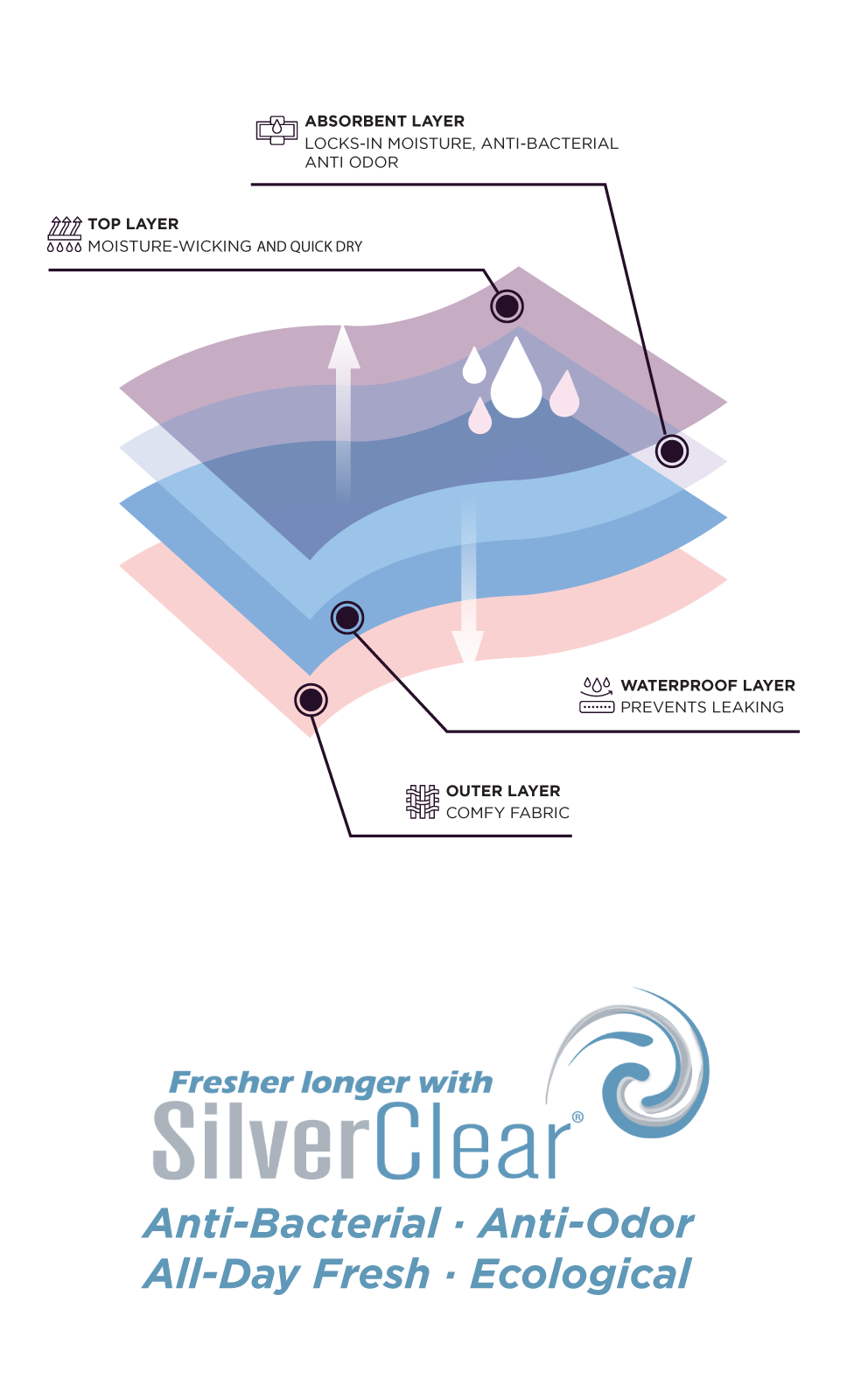 Absorbency | Four layers of moisture-wicking fabric, quick-lock dryness, no PFAs or chemicals | Man-made materials that can contain PFAs and harmful chemicals |